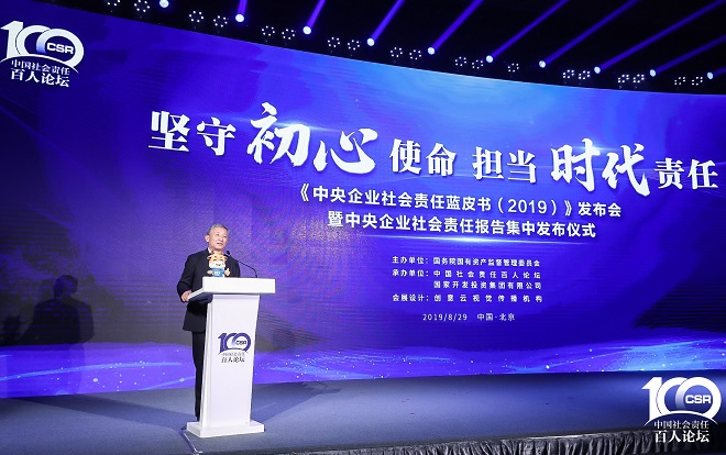 8月29日下午,國資委秘書長彭華崗出席由國資委主辦,中國社會責任百人論壇、國投集團承辦的《中央企業社會責任藍皮書(2019)》發布會暨中央企業社會責任報告集中發布儀式并致辭。