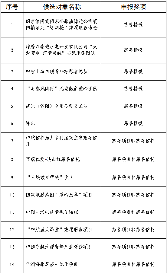 按照《民政部關于開展第十二屆“中華慈善獎”評選表彰活動的通知》(民函﹝2022﹞11號)要求,經中央企業推薦、國資委審核,并經第十二屆“中華慈善獎”評委會辦公室第一次會議研究,現將通過形式審查的《第十二屆“中華慈善獎”候選名單》進行公示,公示期為2022年10月28日至11月3日,具體如下。