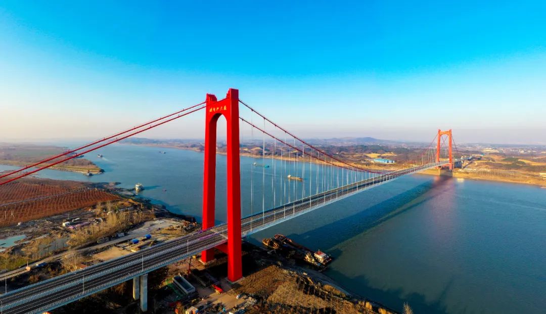 中國鐵建首座千米級跨度懸索橋——湖北棋盤洲長江公路大橋,主跨1038米