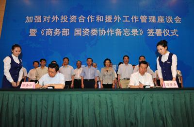 8月23日,商務部和國資委在京聯合召開“加強對外投資合作和援外工作管理座談會”,并簽署《商務部 國資委協作備忘錄》,這是推動中央企業加快實施“走出去”戰略,促進中央企業對外投資合作持續健康發展的重要舉措。商務部部長陳德銘、國資委主任王勇代表雙方簽字。商務部副部長傅自應通報了近期對外投資合作及援外工作情況和存在的問題,國資委副主任黃丹華介紹了《協作備忘錄》的主要內容。商務部部長助理李榮燦主持座談會和《協作備忘錄》簽署儀式。
