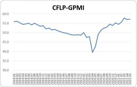 2021年5月份,美洲制造業PMI為59.6%,較上月回升0.4個百分點,連續4個月保持在59%以上,顯示美洲制造業增速較上月稍有加快,美洲經濟保持快速恢復態勢。主要國家中,美國和巴西制造業增速較上月均有不同程度加快。其中,美國制造業PMI保持在61.2%的較高水平,較上月上升0.5個百分點,連續4個月運行在60%以上。ISM報告顯示,需求加快釋放是美國制造業較快恢復的主要原因,美國制造業新訂單指數較上月有所上升。此外,美國制造業的生產和就業增速較上月均有所放緩,生產量指數和從業人員指數較上月均有明顯回落,降幅均超過4個百分點。為了繼續穩住美國經濟恢復成果,拜登政府繼續推出大規模的財政預算。但持續寬松的政策也使得美國通脹壓力逐步加大。4月美國CPI環比增長0.8%,同比增長4.2%,創2008年9月以來最大同比增幅,漲幅超出市場預期。