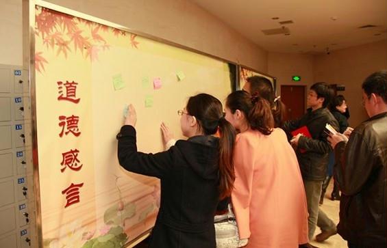 學習身邊的先進人物,他們的事跡就真真切切擺在那里,以身邊人講身邊事、身邊人講自己事、身邊人教身邊人為依托,弘揚真善美,更親近、也更容易讓人接受。活動的最后一個環節,留下了感人的一幕,與會人員紛紛寫下真摯的道德感言,“助人為樂的快樂是真正意義上的快樂”,“傳承愛心,奉獻力量”,“走進道德講堂,學習道德規范,弘揚道德精神,踐行道德實踐”。很多同志也第一時間與兩位老人和所工會聯系,資助學生、為學校捐書,用實際行動踐行愛心感悟。研究所表示將把“道德講堂”作為開展精神文明創建的重要平臺,有計劃地定期開展下去。