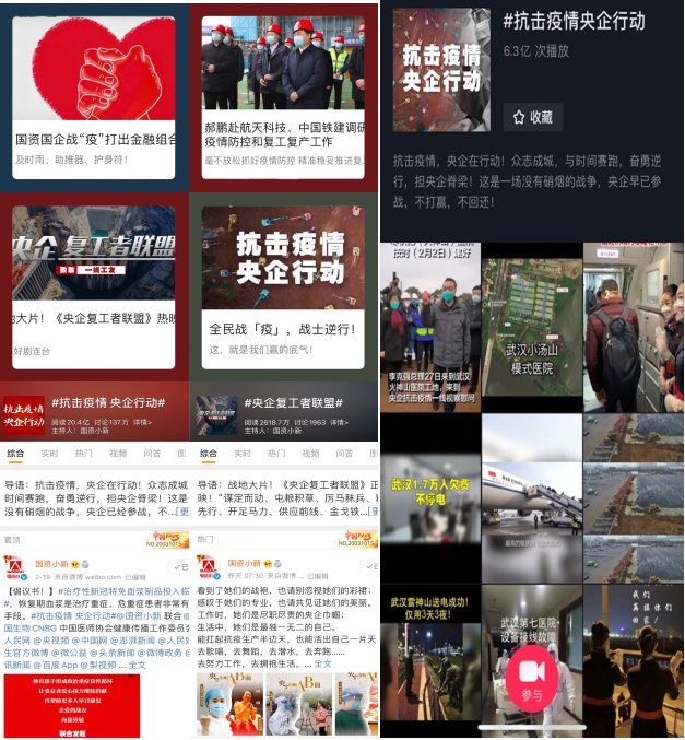 推出原創(chuàng)作品,做好重點(diǎn)報(bào)道。從醫(yī)療、出行、保障等方面及時(shí)匯總央企參與抗擊疫情的相關(guān)內(nèi)容,準(zhǔn)確解讀防控措施、有效消除恐慌情緒、主動(dòng)傳播健康衛(wèi)生知識(shí),堅(jiān)決遏止謠言擴(kuò)散。完成原創(chuàng)重點(diǎn)報(bào)道65篇、深度報(bào)道11篇、系列報(bào)道38篇、發(fā)布微信197篇、微博1135條、短視頻124條、網(wǎng)站信息1450條、英文報(bào)道329條。在國資委網(wǎng)站推出“抗擊疫情 國資央企在行動(dòng)”專題報(bào)道,發(fā)布文字、圖片、視頻等新聞內(nèi)容共366條。在國資委英文網(wǎng)站發(fā)布China's SOEs on Novel Coronavirus Battlefield專題,發(fā)布108篇央企新聞稿件。海外社交媒體平臺(tái)發(fā)布帖文101條,閱讀量60萬+。在國資小新新媒體平臺(tái)持續(xù)編發(fā)抗擊疫情、復(fù)工復(fù)產(chǎn)相關(guān)微博微信,其中7篇10萬+微信文章,#抗擊疫情 央企行動(dòng)#微博話題閱讀量20.8億,快手話題閱讀量10.5億,抖音話題閱讀量6.3億。在《國資報(bào)告》雜志編輯部推出《央企戰(zhàn)疫紀(jì)實(shí)》等重磅稿件。