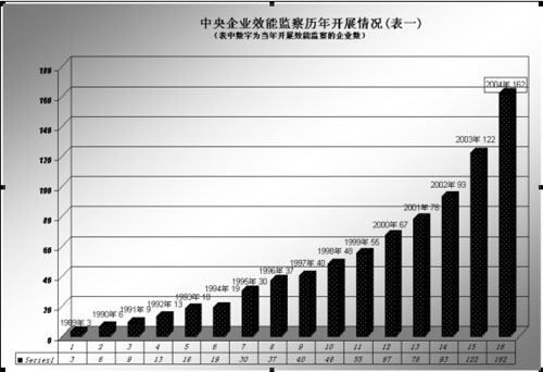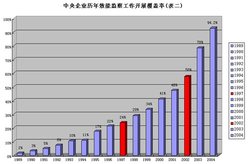 中央企業(yè)效能監(jiān)察工作前后經(jīng)歷了三個(gè)階段:一是1989——1997年,開展效能監(jiān)察工作的中央企業(yè)由3戶發(fā)展到40戶,為起步摸索階段;二是1998——2002年,開展效能監(jiān)察工作的中央企業(yè)由40戶發(fā)展到93戶,為推廣階段;三是2003——2004年,開展效能監(jiān)察工作的中央企業(yè)由93戶發(fā)展到162戶,為普及發(fā)展階段。兩年間中央企業(yè)開展效能監(jiān)察工作新增69家,工作普及率提高了46.8%,而且,正在向各類公司制企業(yè)延伸。2003年1月至2004年底,中央企業(yè)及其所屬二級(jí)以上企業(yè)效能監(jiān)察工作共立項(xiàng)23344項(xiàng),其中:國有獨(dú)資企業(yè)立項(xiàng)20336項(xiàng)、股份制企業(yè)立項(xiàng)2877項(xiàng)、中外合資企業(yè)立項(xiàng)53項(xiàng)、境外企業(yè)立項(xiàng)78項(xiàng)。可以說,目前中央企業(yè)效能監(jiān)察工作領(lǐng)域覆蓋了各類公司制企業(yè)。(附表一、表二)