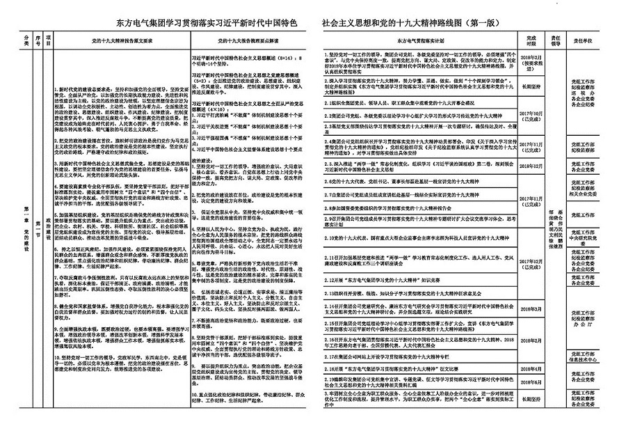 為深刻領(lǐng)會習(xí)近平新時代中國特色社會主義思想精髓和黨的十九大精神核心要義,著力在學(xué)懂、弄通、做實(shí)上下功夫,東方電氣黨組牢固樹立“四個意識”,對照黨的十九大報告,從黨的建設(shè)、制造強(qiáng)國、一帶一路、深化改革、脫貧攻堅和企業(yè)文化等六個方面繪就了《東方電氣集團(tuán)學(xué)習(xí)貫徹落實(shí)習(xí)近平新時代中國特色社會主義思想和黨的十九大精神路線圖》,為東方電氣開啟新征程新使命提供行動指南。