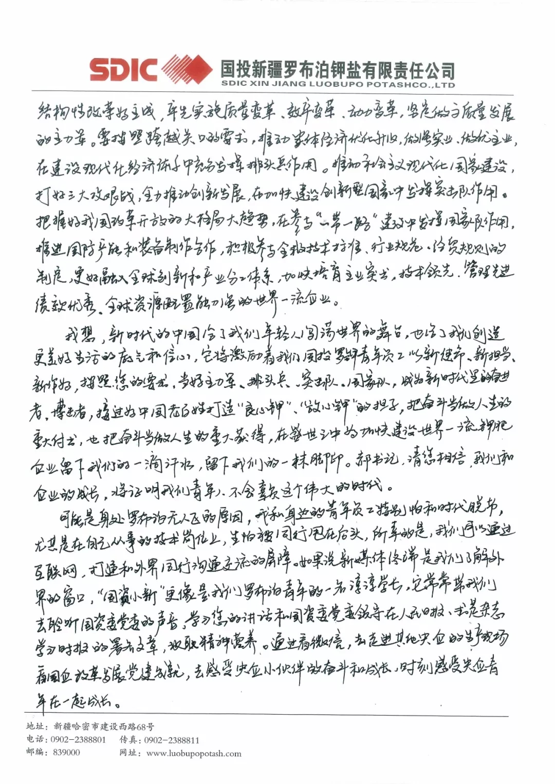 我想,新時代的中國給了我們年輕人闖蕩世界的舞臺,也給了我們創造更美好生活的底氣和信心。它將激勵著我們國投羅鉀青年員工以新使命、新擔當、新作為,按照您的要求,當好主力軍、排頭兵、突擊隊、國家隊,成為新時代里的奮進者、搏擊者,接過為中國老百姓打造“良心鉀”、“放心鉀”的擔子,把奮斗當做人生的重大付出,也把奮斗當做人生的重大獲得,在盛世之中為加快建設世界一流鉀肥企業留下我們的一滴汗水,留下我們的一抹腳印。郝書記,請您相信,我們和企業的成長,將證明我們青年人不會辜負這個偉大的時代。