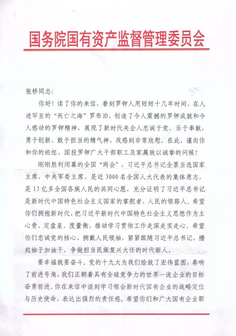 我是國投新疆羅布泊鉀鹽有限責任公司的一名普通的85后員工。前幾天,通過“國資小新”微信看到了您在接受《求是》雜志專訪的《新時代國有企業的戰略定位與歷史使命》文章,受益匪淺。您的思考,通篇貫徹著習近平新時代中國特色社會主義思想,為我們講述了新時代國有企業的戰略定位、歷史使命和改革發展的新目標新舉措,不僅解開了我們基層員工的一些思想困惑,也指明了我們國企未來的發展方向。所以,就想通過寫信的方式和您交流一下學習心得。
