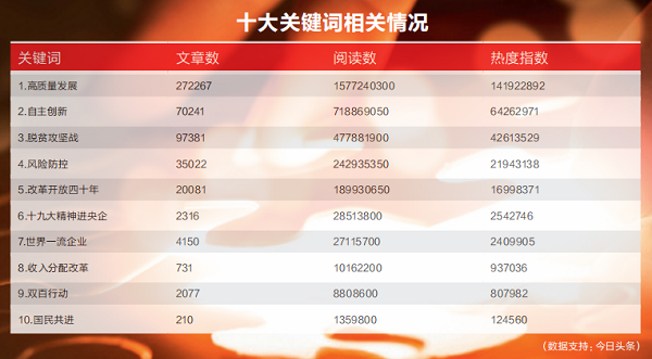 它們分別為:十九大精神進央企、高質量發展、自主創新、脫貧攻堅戰、風險防控、改革開放四十年、世界一流企業、收入分配改革、雙百行動、國民共進。