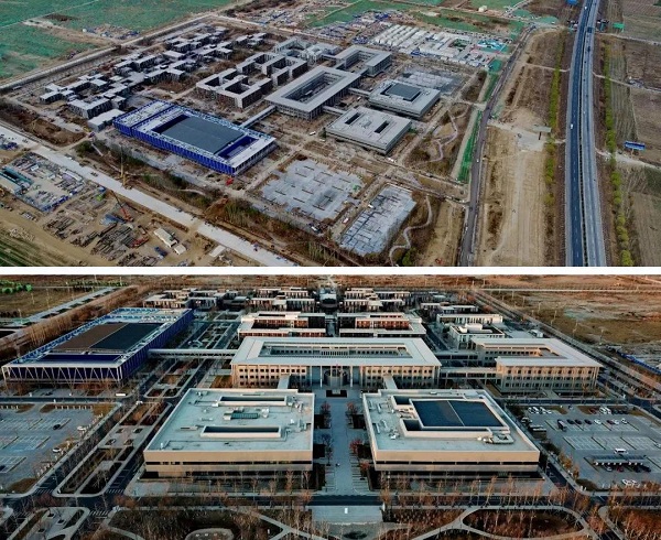 拼版照片:上圖為2018年3月29日拍攝的正在建設中的雄安市民服務中心;下圖為2018年12月7日拍攝的竣工并已投入使用的雄安市民服務中心。