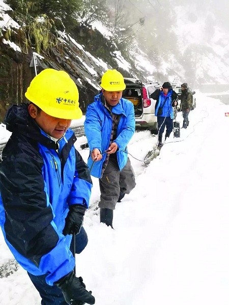 中國電信員工在大雪封山的季節(jié),將光纜拉進(jìn)獨(dú)龍江