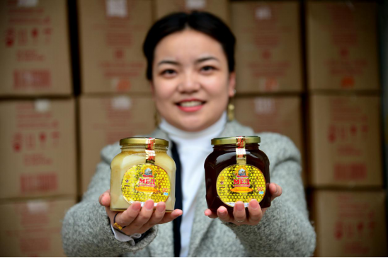 圖為2019年1月27日,工作人員展示年貨專列運來的哈薩克斯坦純天然蜂蜜。唐振江 攝