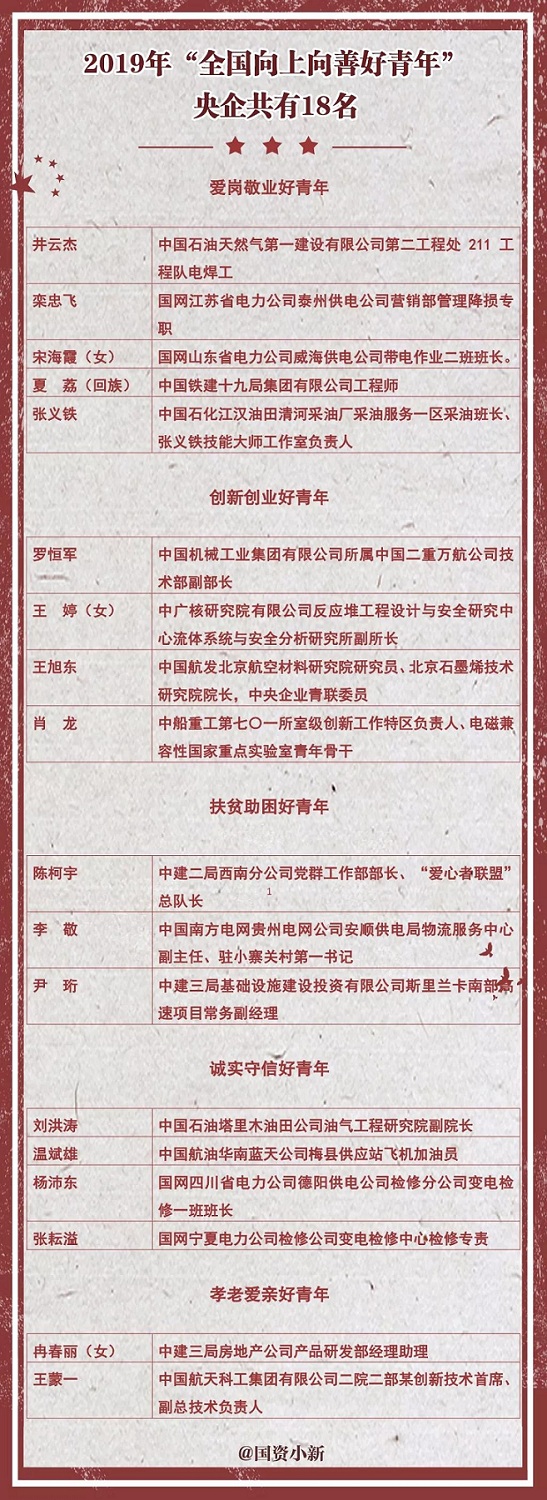 在紀念五四運動100周年之際,共青團中央還公布了2019年“全國向上向善好青年”名單,共有120名優秀青年獲此榮譽,其中央企有18名青年代表。