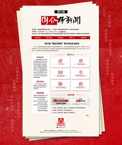 本屆“國企好新聞”推介活動將集中推介2018年7月1日至2019年7月1日期間發(fā)表的涉及國資國企改革發(fā)展的優(yōu)秀新聞作品,評選出十大新聞創(chuàng)客。其中,文字類新聞作品將設(shè)一等獎3個,二等獎6個,三等獎9個;廣播電視類、“三微”類、國際傳播類新聞作品將分設(shè)一等獎1個,二等獎2個,三等獎5個,并設(shè)立特別獎若干。在經(jīng)國家正式批準(zhǔn)的報紙、刊物、廣播電臺、電視臺;經(jīng)國務(wù)院新聞辦公室批準(zhǔn)的、具有登載新聞業(yè)務(wù)資質(zhì)的新聞網(wǎng)站;經(jīng)國有企業(yè)官方認(rèn)證的新媒體賬號;以外語撰寫在我國外宣媒體或?qū)ο髧襟w發(fā)表的原創(chuàng)新聞作品均可參與相關(guān)推介。