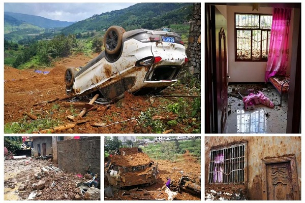 小汽車被滑坡的巨大威力掀翻、車窗被滾落的泥土砸碎、民房被掩蓋……各方力量正在進行緊張救援。