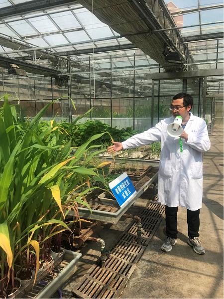 沈陽中化農藥化工研發有限公司生測研發部科學家在實驗棚里介紹殺菌劑的應用