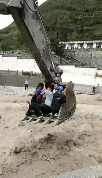 搶險(xiǎn)路被洪水封堵,保障人員“乘坐”挖掘機(jī)前去搶險(xiǎn)。
