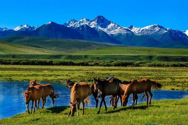 山丹馬場地處海拔約2850米的草原。近處水草豐茂,遠處群山連綿。山丹馬場坐落于甘肅河西走廊中部、祁連山冷龍嶺北麓。