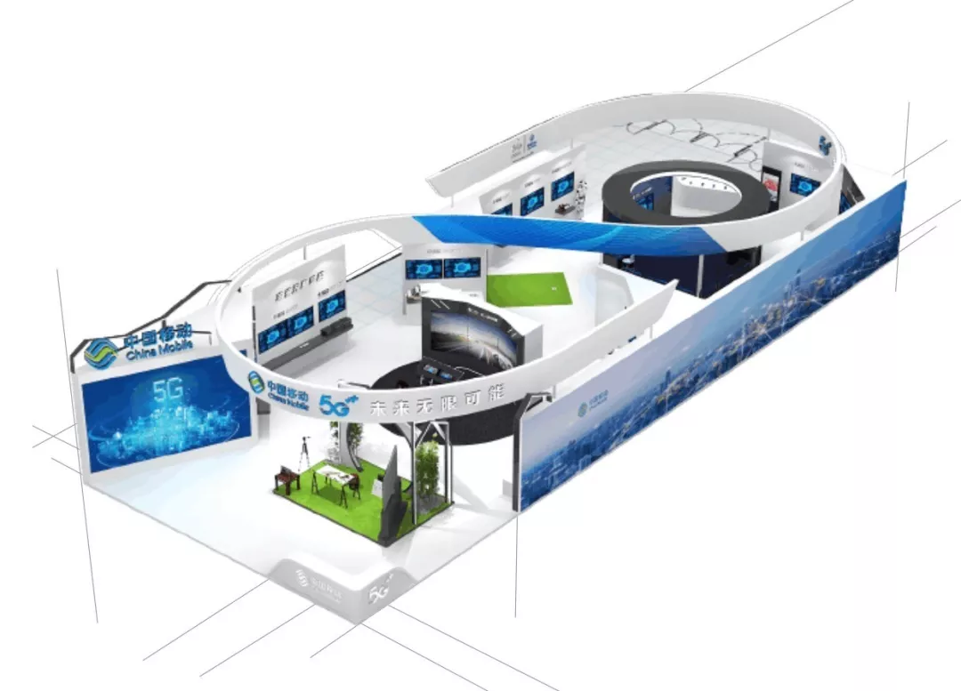 造型獨特的中國移動展區(qū)以“∞”型的設(shè)計,象征著5G看移動,未來無限可能。