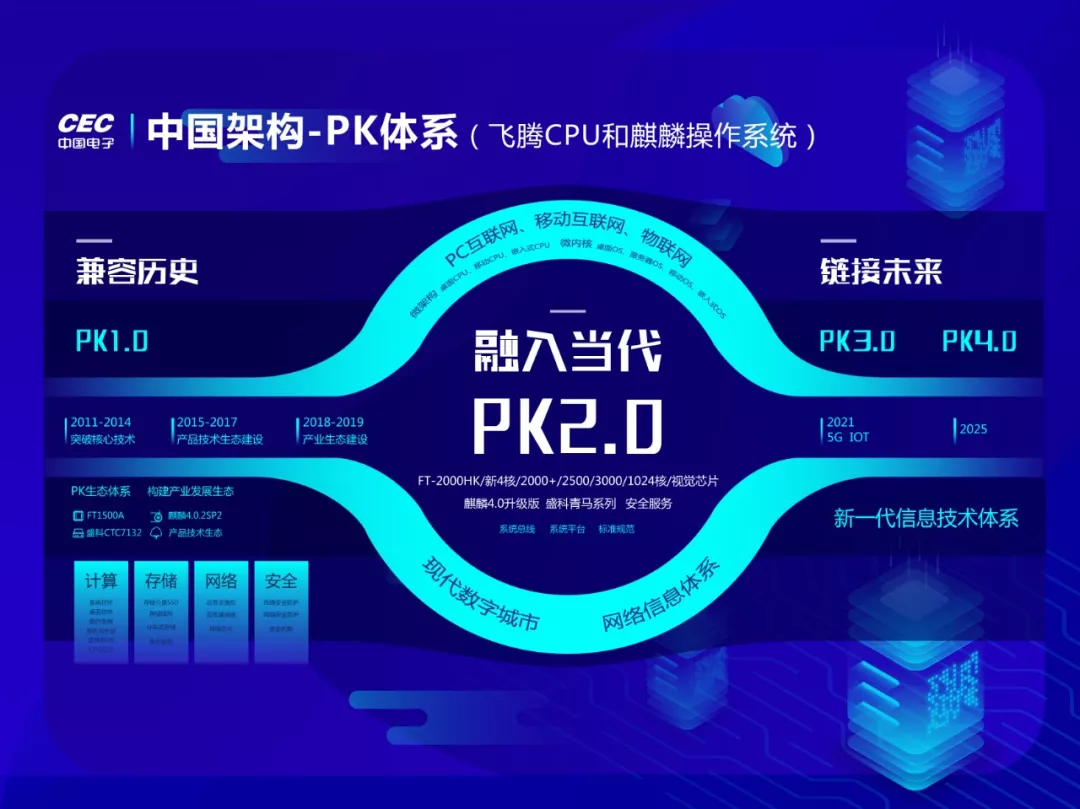 此次世界互聯(lián)網(wǎng)大會,中國電子PK 2.0體系首次全新亮相。該體系是由飛騰2000系列CPU與之配套的麒麟4.02系列操作系統(tǒng),以及盛科青馬系列交換芯片,輔之以復(fù)雜信息系統(tǒng)場景,兼容移動、云、(虛擬化)、大數(shù)據(jù)和物聯(lián)網(wǎng)、人工智能等最新技術(shù)的產(chǎn)品組合生態(tài)。