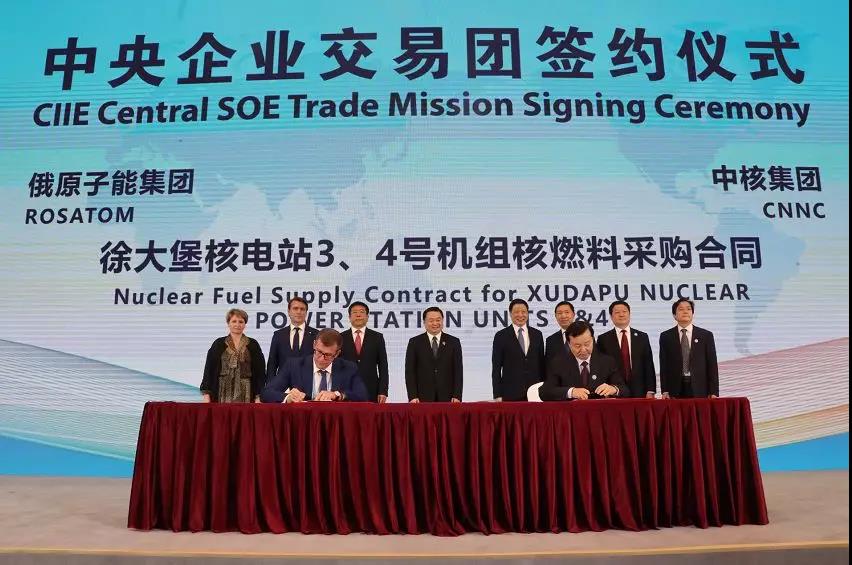 中核集團與俄羅斯國家原子能集團公司簽署了《徐大堡3/4號機組燃料采購合同》。多年來,中核集團與俄羅斯國家原子能集團公司在核領域開展了廣泛的合作,取得了豐碩成果。截至目前,實驗快堆建造、田灣核電1-4號機組工程等項目已完成,后續核電項目等一攬子合作正在順利推進。進博會期間,中核集團還與法國電力集團、歐安諾集團、法馬通公司等簽署了多項合作協議。