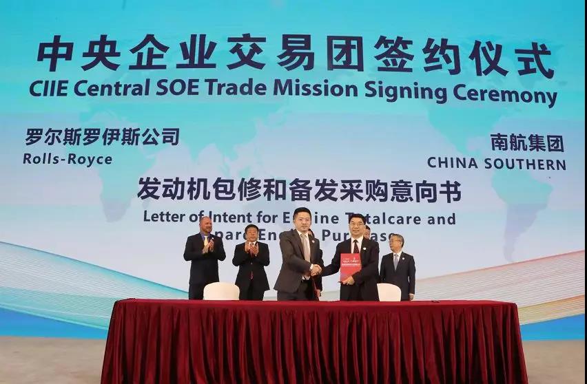 南航集團與英國羅爾斯羅伊斯公司簽署《發動機包修和備發采購意向書》,此項簽約是第二屆進博會最大的民用航空訂單之一。根據采購意向書,在2019年至2034年的15年間,英國羅爾斯-羅伊斯公司將為南航集團20架空客A350飛機發動機,提供售后包修、備發支援及其他保障類服務,最大程度保障飛機安全、平穩運營。