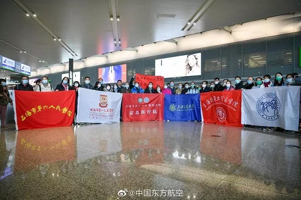 1月28日17時53分,東航第九架包機從上海再次起飛,載著上海第三批援鄂醫療隊共148人及醫療救護物資803件11.7噸