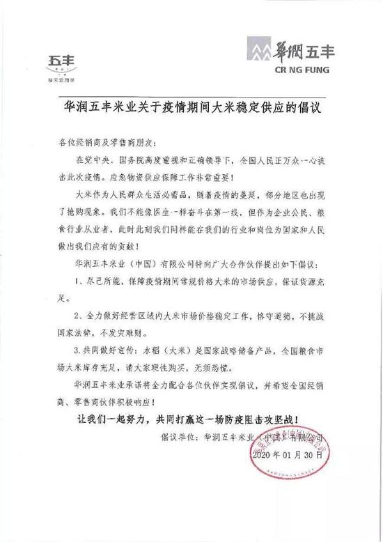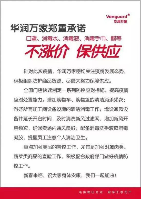 華潤集團旗下華潤萬家、華潤五豐等在疫情發(fā)生后第一時間發(fā)布公告,鄭重承諾“不漲價、保供應”。