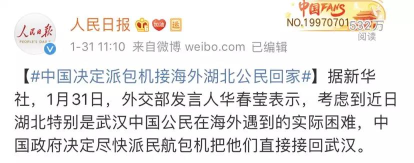 外交部發言人華春瑩表示:考慮到近日湖北特別是武漢中國公民在海外遇到的實際困難,中國政府決定盡快派民航包機把他們直接接回武漢。