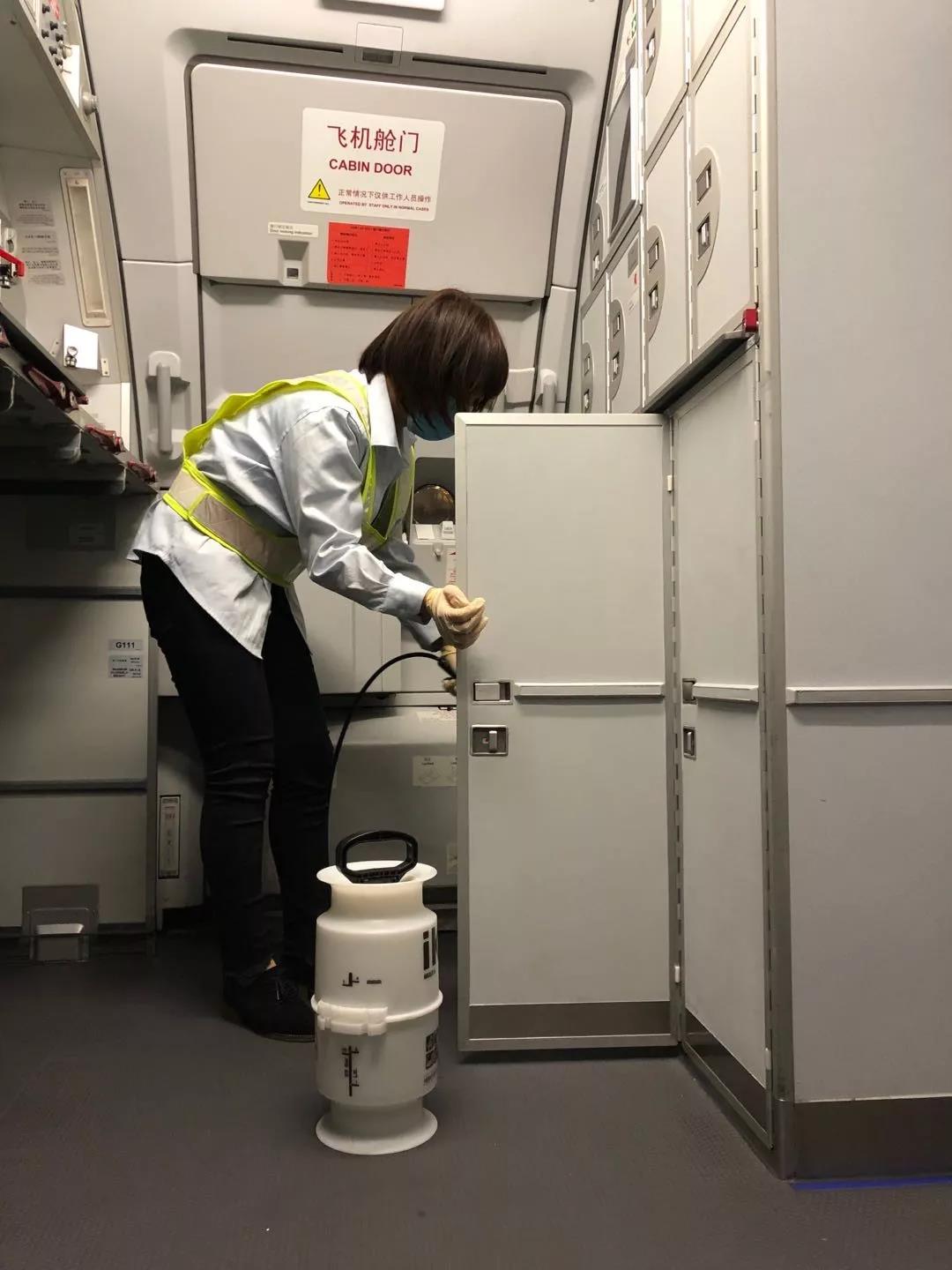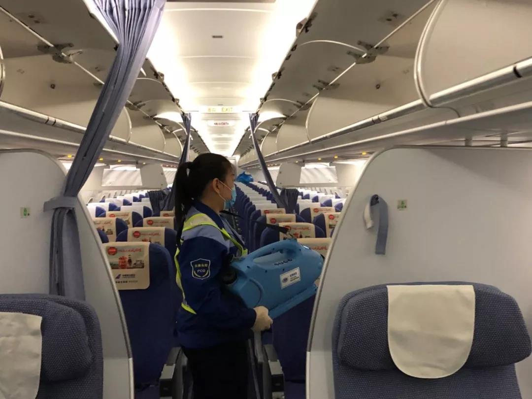 航后清潔:使用消毒劑擦拭客艙門周邊、小桌板、扶手及洗手間等乘客接觸較多的區域。每天航班運行結束后對飛機做預防性消毒。