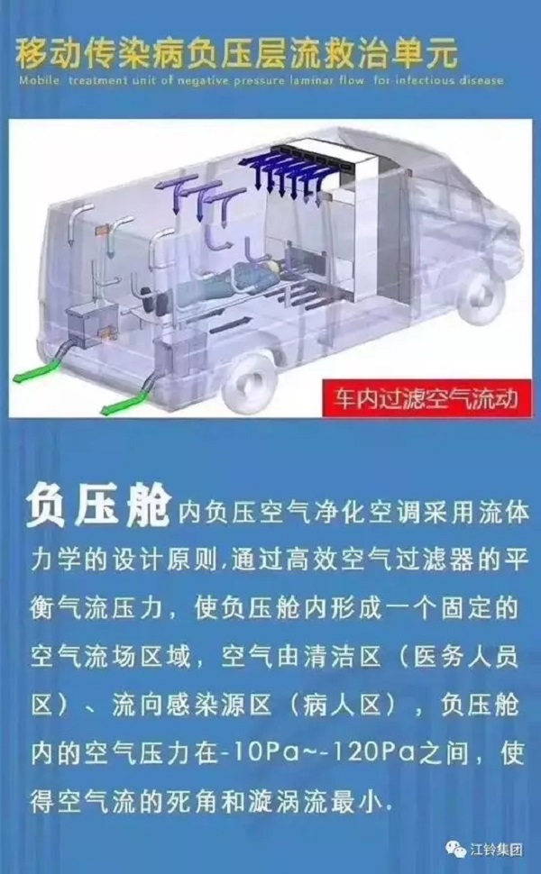 1月29日,兵器裝備集團長安汽車旗下江鈴汽車股份第一輛負壓救護車下線。2月1日,2輛負壓救護車在火神山醫院建成前24小時運抵武漢。2月12日,67輛負壓救護車通過專列發往武漢。目前123輛負壓救護車已交付各地。