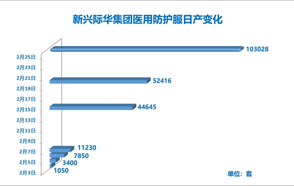 2月25日,新興際華集團醫用防護服日產能達到10.3萬套,相比2月4日正式投產時的日產3400套,提升30倍。而這距離其2月3日批量試產成功僅僅22天。新興際華集團等中央企業從零開始,轉產擴產醫用防護服等重點醫療物資,創造了“中國效率”,關鍵時刻彰顯責任擔當。新興際華集團目前已經累計產出醫用防護服近95萬套。