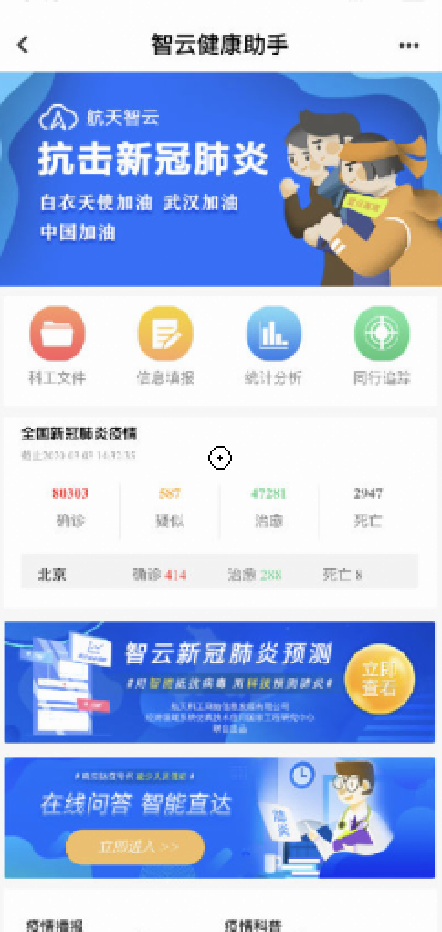 中國航天科工二院網信公司發揮大數據及人工智能技術優勢,開發智云健康助手,為復工復產提供信息捕獲、數據支撐、輔助決策和態勢監控等技術支撐,AI+數據,云上助力疫情防控和應急管理。智云健康助手通過二維碼掃描填報,頁面簡潔、操作便捷,具備疫情信息查詢、疫情信息填報、醫療服務對接、政策文件共享等功能,其中疫情信息填報可實現“出行記錄、健康日報、體溫監控、隔離情況”等常用信息一鍵提交、自動統計。后臺數據實時智能分析、可視化展示,加強了對企業復工復產期間的趨勢分析和疫情預警,讓數據的變化實時顯示,快速精準“阻擊”疫情蔓延,為抗擊疫情、復工復產提供智能分析。目前,智云健康助手已在北京市豐臺區委區政府等政府機構,二院、湖南航天等多家單位推廣應用。