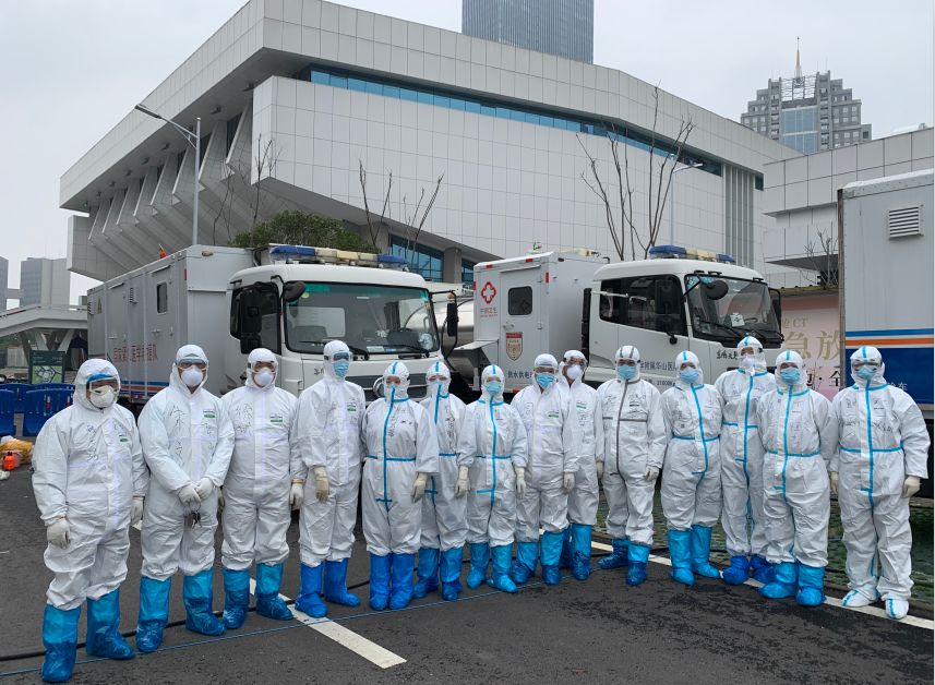 來自中國航天科工的“移動醫院”裝備保障隊員和上海復旦大學附屬華山醫院醫護人員在武昌方艙醫院前合影。
