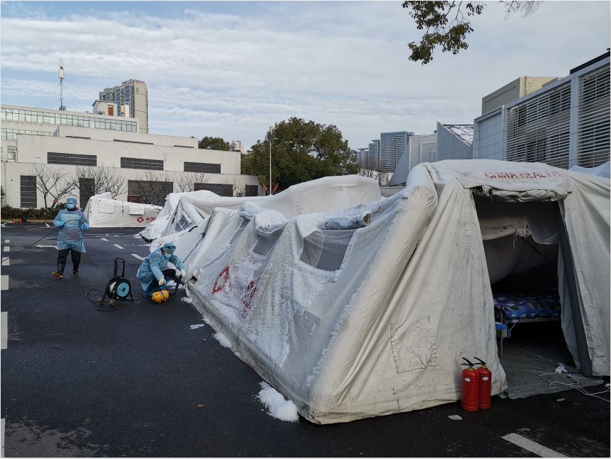 2月14日,武漢突降大雪,保障隊員緊急為帳篷進行除雪。