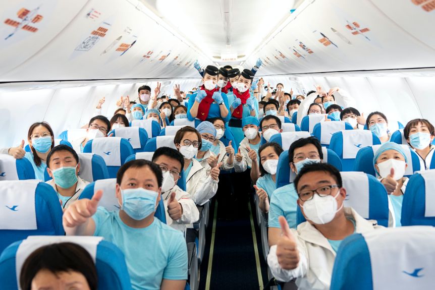 3月17日16:49,南航CZ5242航班搭載著176名新疆馳援湖北醫療隊員從武漢起飛前往烏魯木齊。這是南航首個運送馳援湖北醫療隊返程的包機航班。