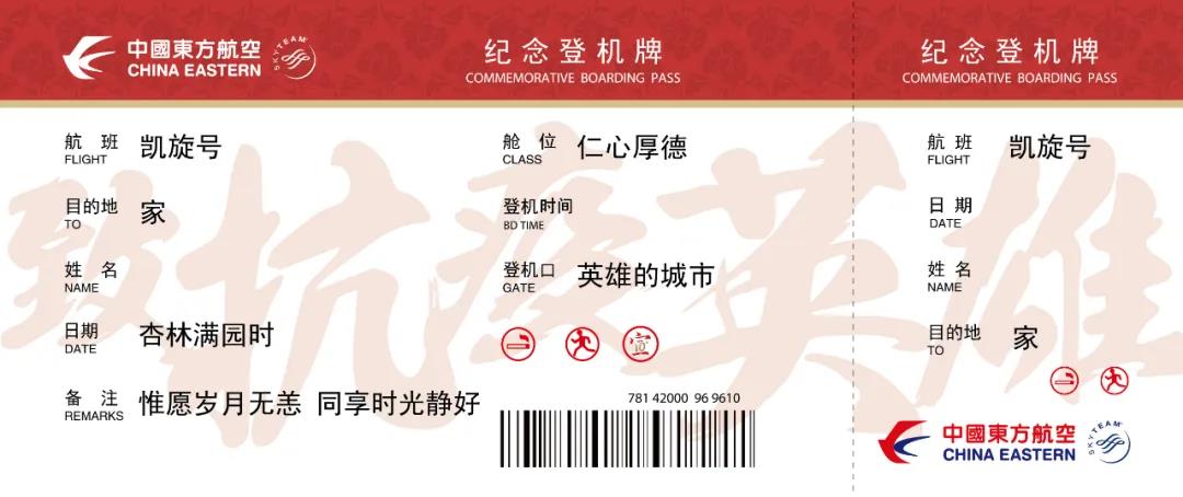 東方航空官方微博特地為迎接抗疫英雄回家打出了一張特別的“紀念登機牌”,從英雄的城市起飛,報以“仁心厚德”,帶著“惟愿歲月無恙,同享時光美好”的美好祝福回“家”,這是對抗擊疫魔、守護山河的白衣天使們最誠摯的感謝與最崇高的致敬。