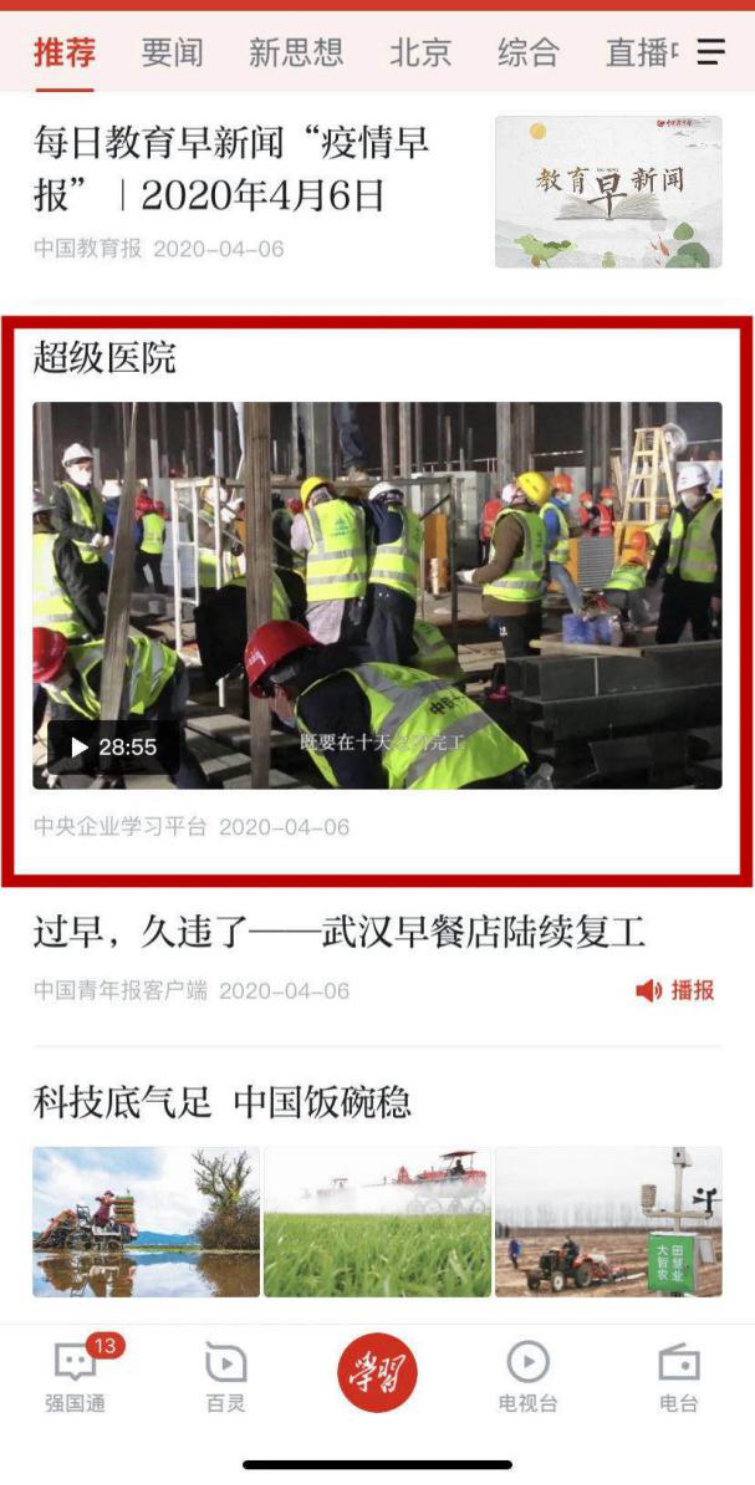 首部破解全球“網紅醫院”火神山醫院建設密碼的紀錄片《超級醫院》,4月6日在學習強國平臺和國資委網站、國資小新新媒體平臺首發,隨后中紀委網站和新華社客戶端、人民視頻、央視頻、愛奇藝、騰訊、喜馬拉雅、咪咕視頻等多個平臺在首頁重要位置轉載,引起了廣大網民的廣泛關注和熱議。截至4月10日夜,網上播放量達到560萬人次。