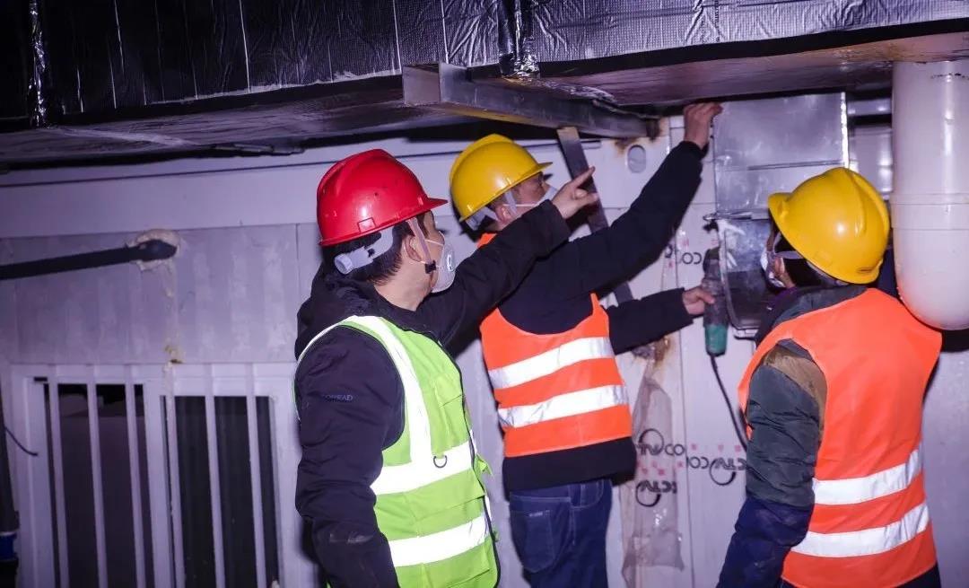 羅文浩(左一)在火神山現場指導工人進行通風管道安裝