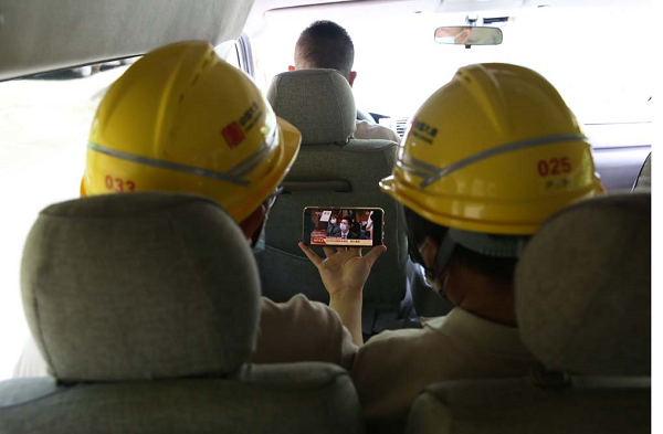 中國石油西部鉆探準(zhǔn)東鉆井公司90008鉆井隊(duì)員工用手機(jī)在工作現(xiàn)場(chǎng)收看十三屆全國人大三次會(huì)議開幕會(huì)直播。