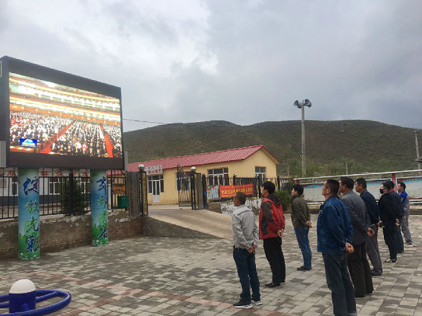 在內(nèi)蒙古赤峰,來自中國能建西北電建的赤峰大虎臺(tái)風(fēng)電吊裝10萬千瓦清潔供暖風(fēng)電項(xiàng)目部職工,在當(dāng)?shù)卮逦瘯?huì)門口通過大屏幕觀看十三屆全國人大三次會(huì)議開幕會(huì)直播。