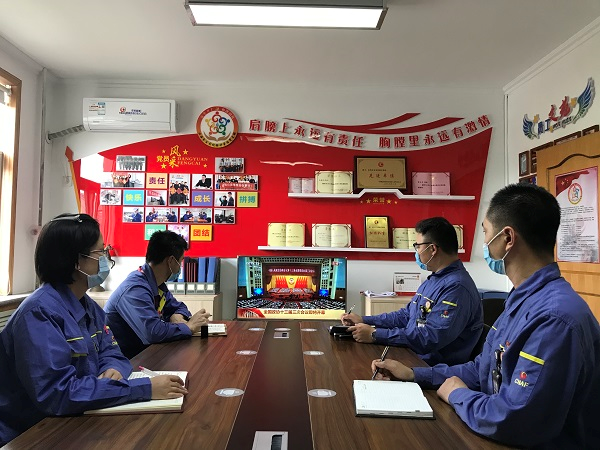 中國化學(xué)工程所屬中化學(xué)交建第三工程公司員工觀看李克強(qiáng)總理作政府工作報(bào)告。