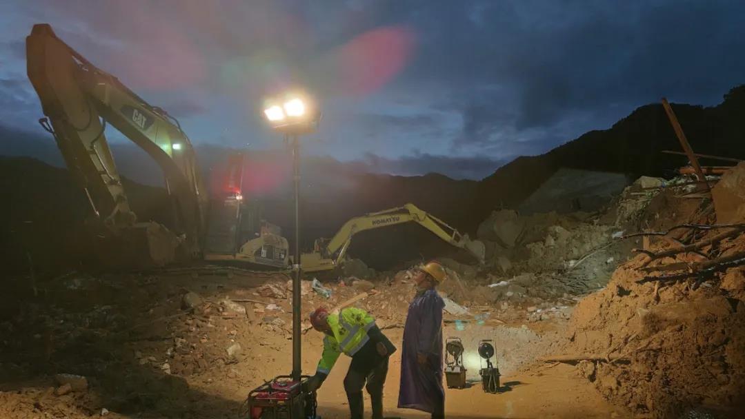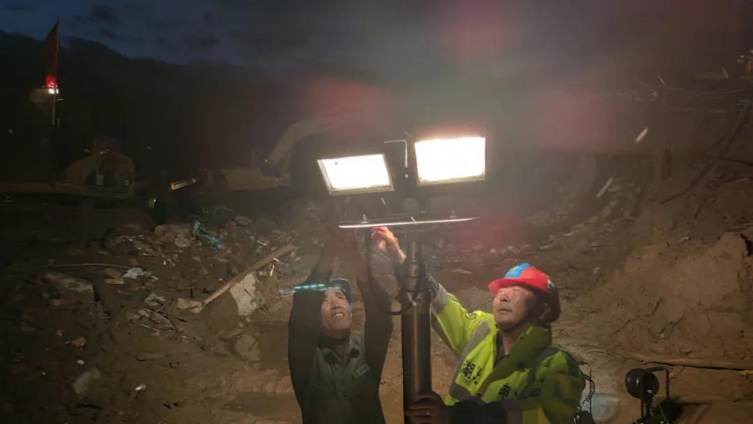 應急發電車照明范圍有限,需要配合救援需求適當移動。33名搶險隊員早已渾身濕透,在一片泥濘中繼續堅守,時刻保障現場照明用電。