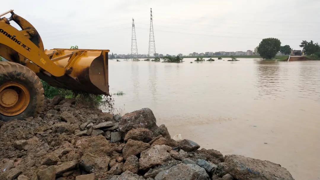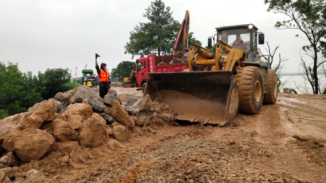 現場不斷有運輸車將石塊等物料倒入漫決口,旁邊的挖掘機隨即開始平整。
