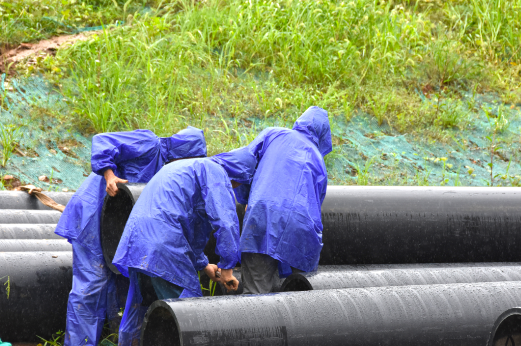 連續一周的強降雨致使城區港道積水,市民出行受阻,中國能建南方建設武穴項目部安排5臺挖機、15名施工人員配合市防汛指揮部安裝臨時PE管,通過增壓泵將城區內積水逐步排出。經過兩天兩夜的堅守,7月9日,橫貫城區、長江的排澇PE管安裝完畢,城區內積水得以緩解。
