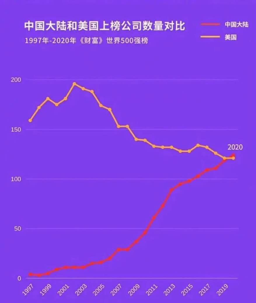 今年,中國大陸(含香港)公司上榜數(shù)量達(dá)到124家,歷史上第一次超過美國(121家)——《財(cái)富》官方稱之為“歷史性跨越”。加上中國臺灣地區(qū)企業(yè),中國共有133家公司上榜,再次刷新紀(jì)錄。而1997年,中國大陸只有四家企業(yè)上榜。