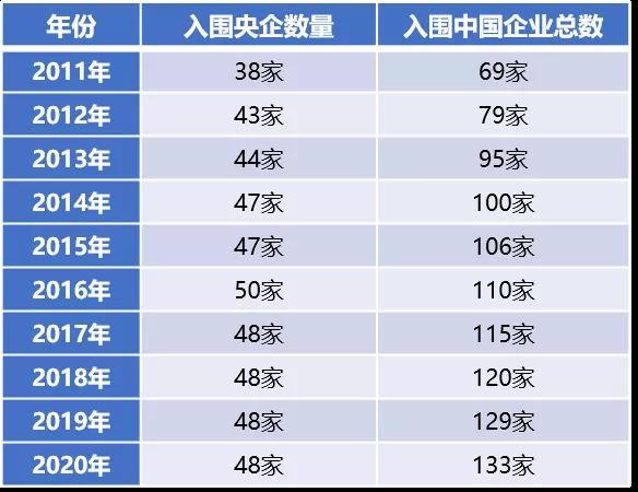 國務(wù)院國資委監(jiān)管的中央企業(yè)中,有48家上榜,與2019年的數(shù)量持平。自2017年起,央企入圍數(shù)量已經(jīng)連續(xù)4年穩(wěn)定在48家。事實(shí)上,中央企業(yè)入圍從數(shù)量從2003年的6戶飆漲到2013年44戶,基本保持穩(wěn)定。雖然近幾年中央企業(yè)上榜數(shù)量一直保持穩(wěn)定,變化不大,但其內(nèi)在的質(zhì)變值得關(guān)注。