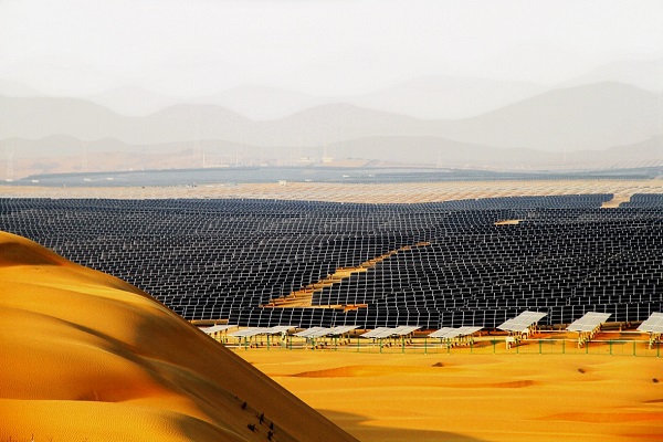 內蒙古達拉特旗國家光伏應用領跑基地。沙漠光伏是推動沙漠清潔能源經濟、沙漠生態治理、沙漠有機農業和沙漠風情旅游的多產業融合發展項目