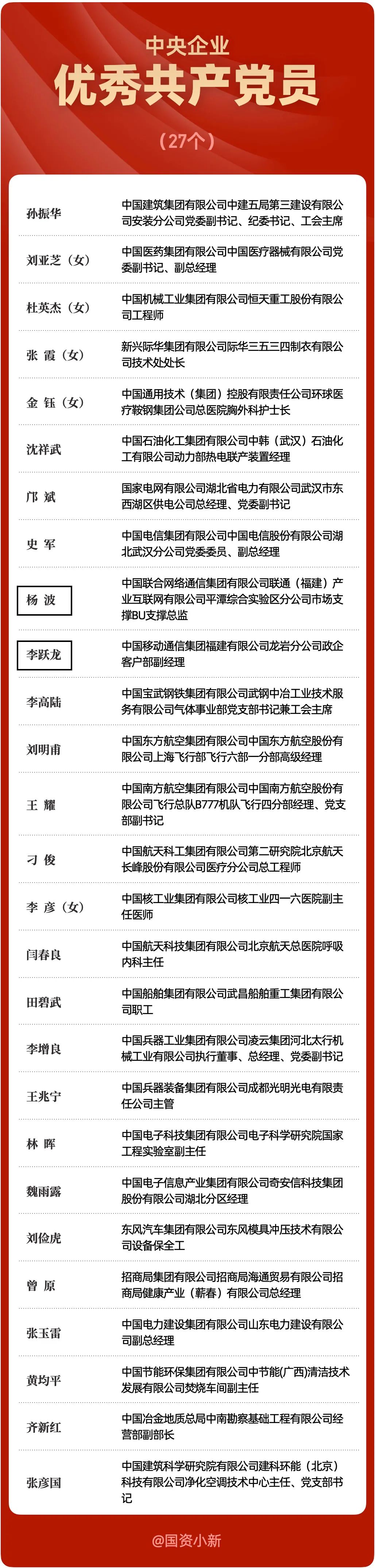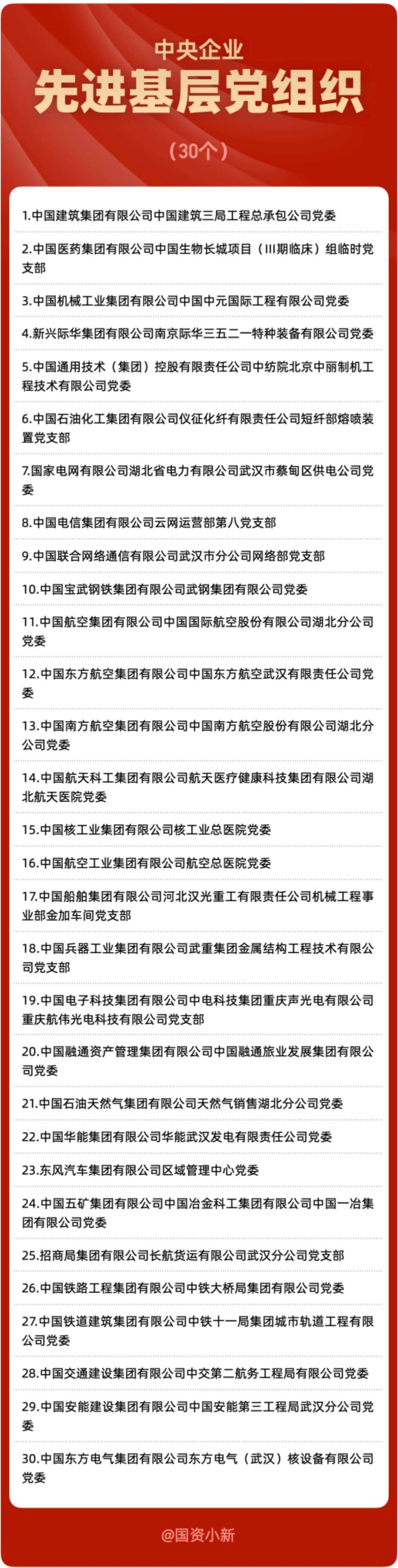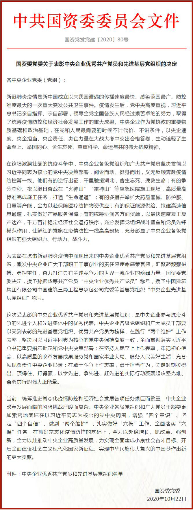 國(guó)資委黨委印發(fā)《國(guó)資委黨委關(guān)于表彰中央企業(yè)優(yōu)秀共產(chǎn)黨員和先進(jìn)基層黨組織的決定》,授予孫振華等共產(chǎn)黨員“中央企業(yè)優(yōu)秀共產(chǎn)黨員”稱號(hào);授予中國(guó)建筑集團(tuán)有限公司中國(guó)建筑三局工程總承包公司黨委等基層黨組織“中央企業(yè)先進(jìn)基層黨組織”稱號(hào)。