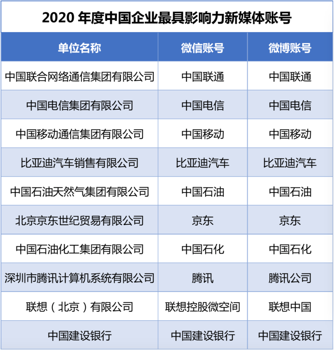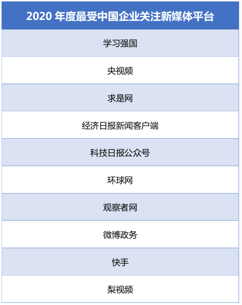 此外,根據前期征集和網友推薦,經過粉絲投票、企業投票、專家評審,最終產生10個“2020年度最受中國企業關注新媒體平臺”。