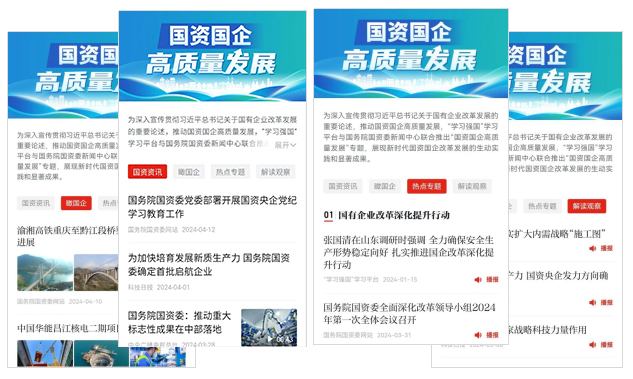常設專題包括國資資訊、瞰國企、熱點專題和解讀觀察四大版塊,圖文并茂,全景式展現國資國企在黨的建設、改革發展、社會責任、民生保障等方面的生動實踐,彰顯了新時代國有企業的新風貌。